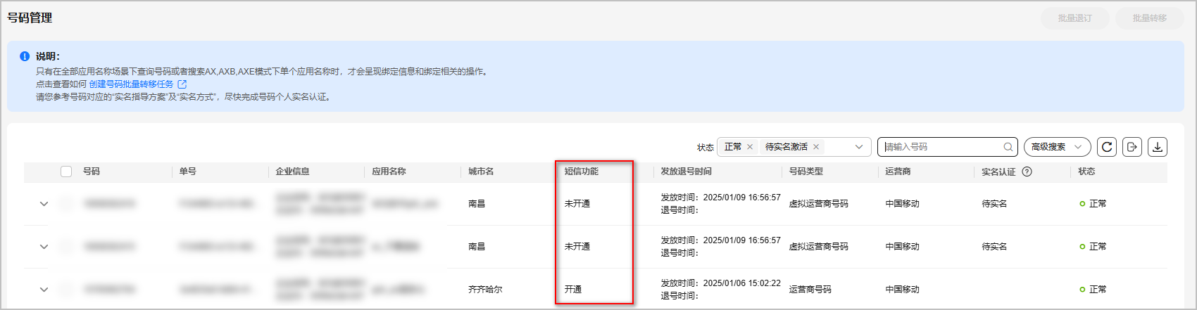 - 转发短信的隐私号码未开通短信功能。在控制台点击“号码管理”,输入转发短信的隐私号码查询该号码是否开通了短信功能。若未开通,可通过“批量修改短信能力”开通隐私号码的短信功能。