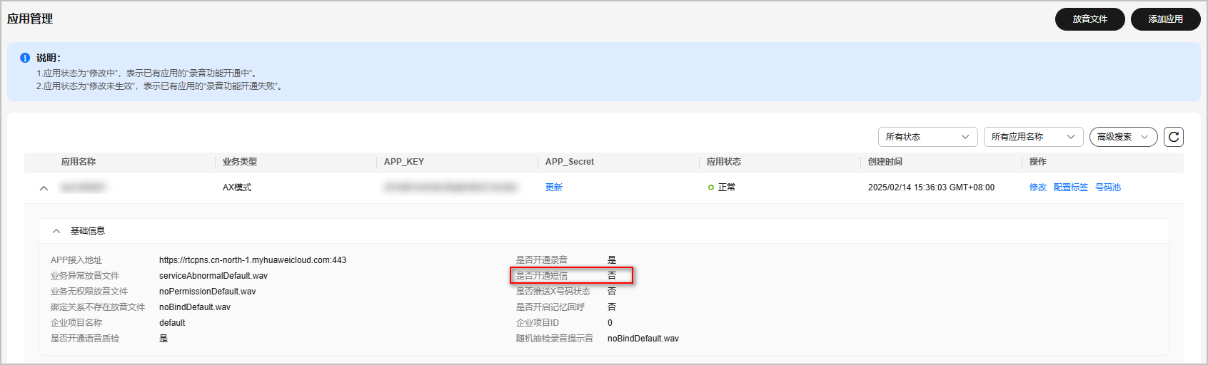 - 转发短信的隐私号码所属应用未开通短信功能。登录“控制台--应用管理”查看转发短信的隐私号码所属应用的详情(点击应用左侧三角箭头查看),查看该应用是否开通了短信功能。若未开通,可点击“操作-修改”,将“是否开通短信”修改为“是”。