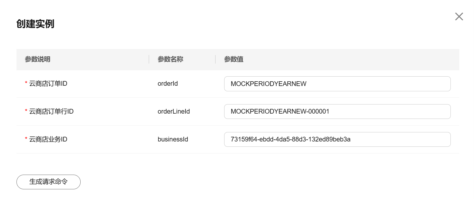 - 在“创建实例”页签,填写预置的各个参数值,单击“生成请求命令”生成请求消息示例。