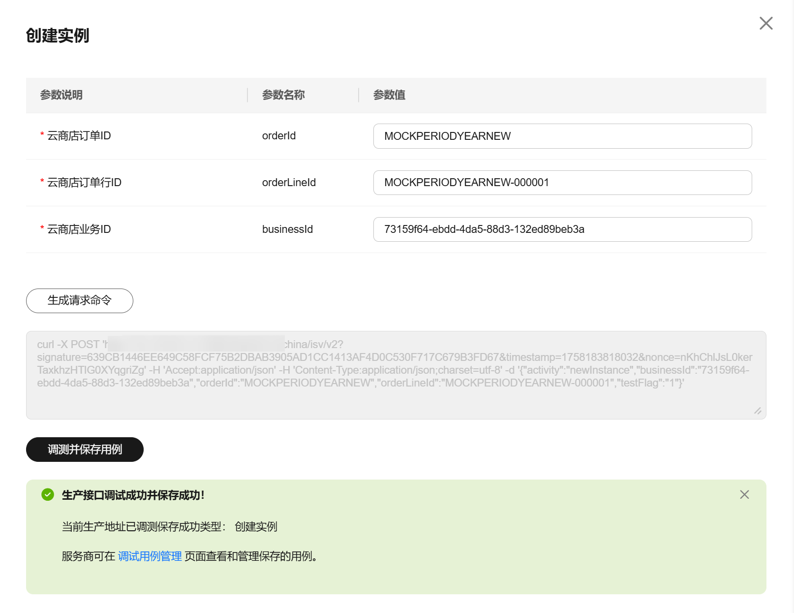- 单击“调测并保存用例”,系统会调用生产链接进行接口测试,如测试成功,则系统提示“调测用例成功并保存成功”;如测试失败,则会在页面下方展示对应错误信息,商家可根据对应信息进行接口修改。