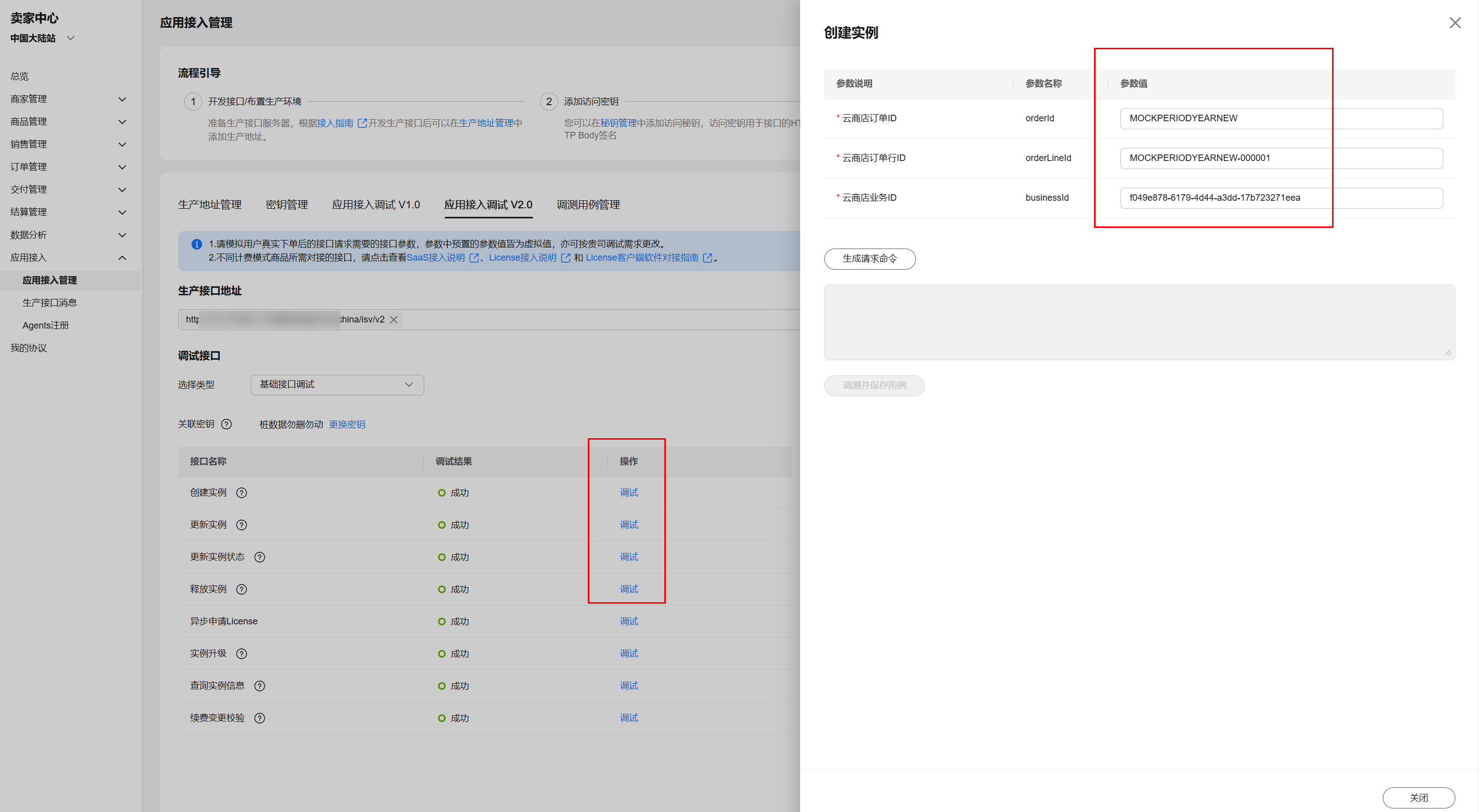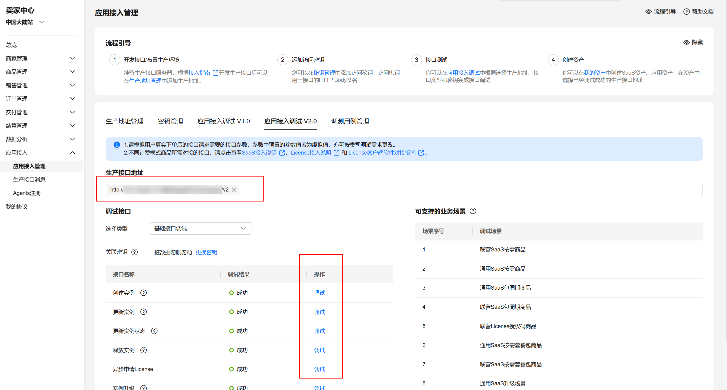为了保证使用SaaS接入方式的正确性,云商店为商家在卖家中心搭建了应用接入调试界面。商家可以在此页面调试SaaS接口在各个调用场景的正确性。