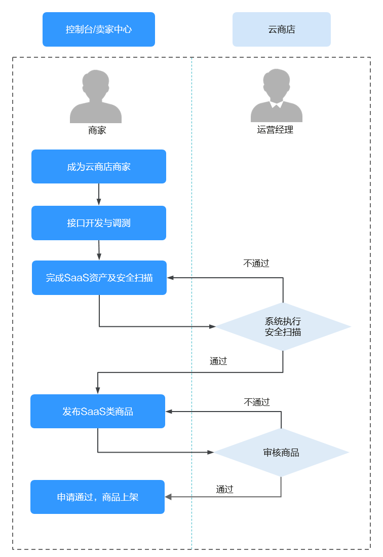 通用和华为自营SaaS类商品接入云商店的详细流程如下图所示: