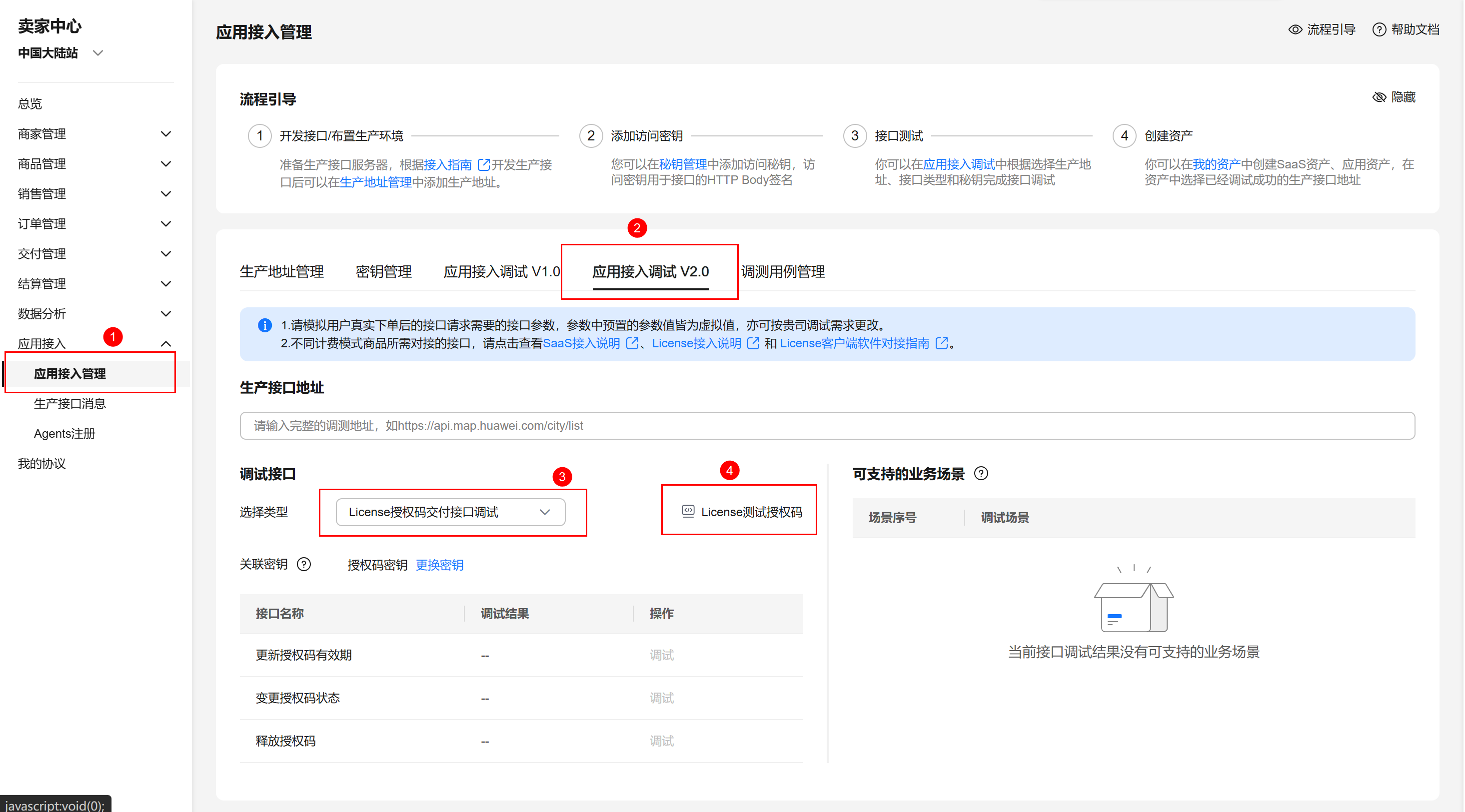 - 在“卖家中心 > 应用接入 >应用接入管理 > 应用接入调试 V2.0”中,选择“License授权码交付接口调试”点击”License测试授权码”。
