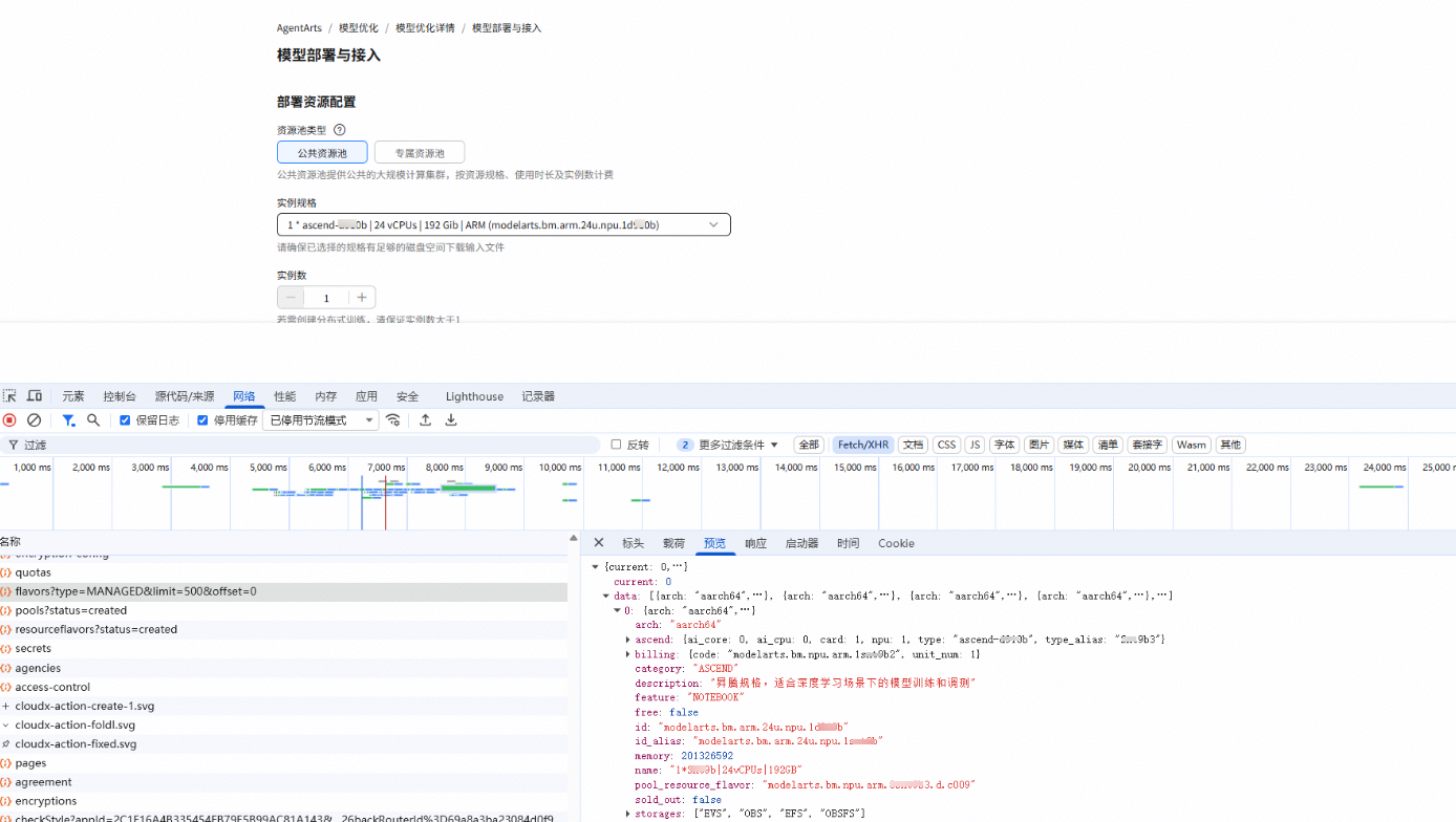 | ma_instance_flavor | 是 | String | 参数解释: ModelArts实例规格。 AgentArts平台智能体优化功能中,在部署并接入模型页面,按F12通过开发者工具可查看资源池的规格信息。 图2 查看资源池规格 约束限制: 不涉及 取值范围: ModelArts支持的计算实例规格字符串。 默认取值: 无 |