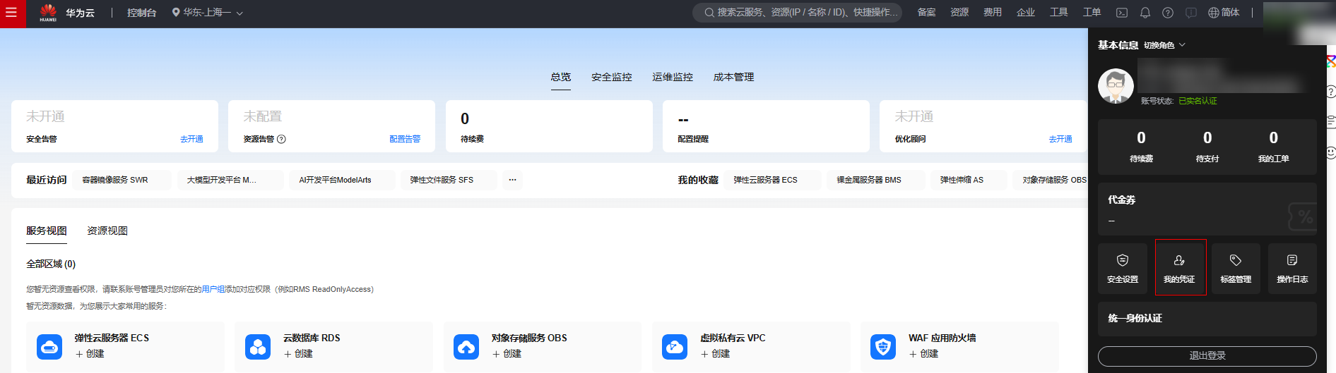 - 单击用户名,在下拉列表中单击“我的凭证”。