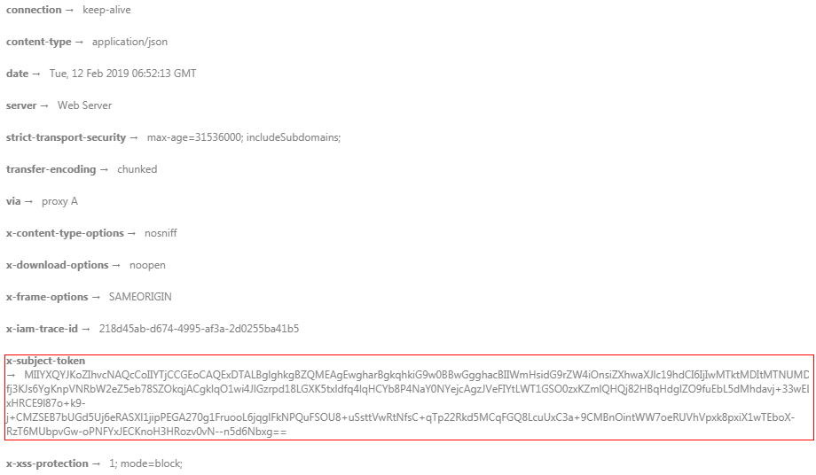 对于获取用户Token接口,返回如图1所示的消息头,其中“x-subject-token”就是需要获取的用户Token。有了Token之后,您就可以使用Token认证调用其他API。