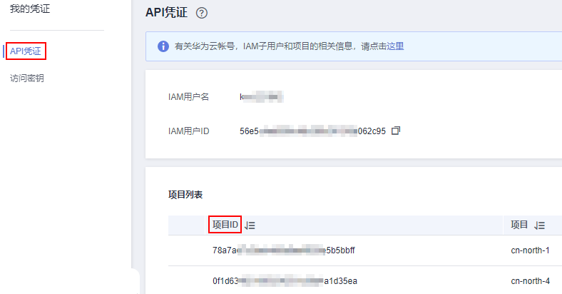 项目ID还可以通过调用查询指定条件下的项目信息API获取。