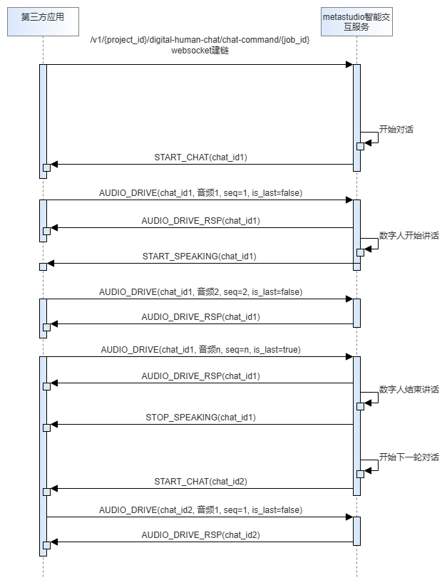 - MetaStudio发送的启动会话消息START_CHAT,会返回chat_id字段。用户发送音频驱动消息AUDIO_DRIVE、中断对话消息INTERRUPT_CHAT或结束对话消息STOP_CHAT时,都需要携带该chat_id。