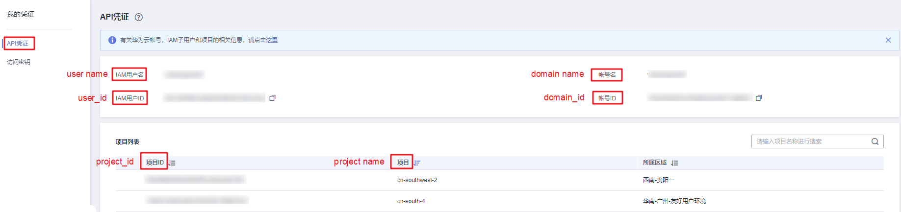 - 在“我的凭证”界面,API凭证页签中,查看账号名、账号ID、用户名、用户ID、项目名称、项目ID。