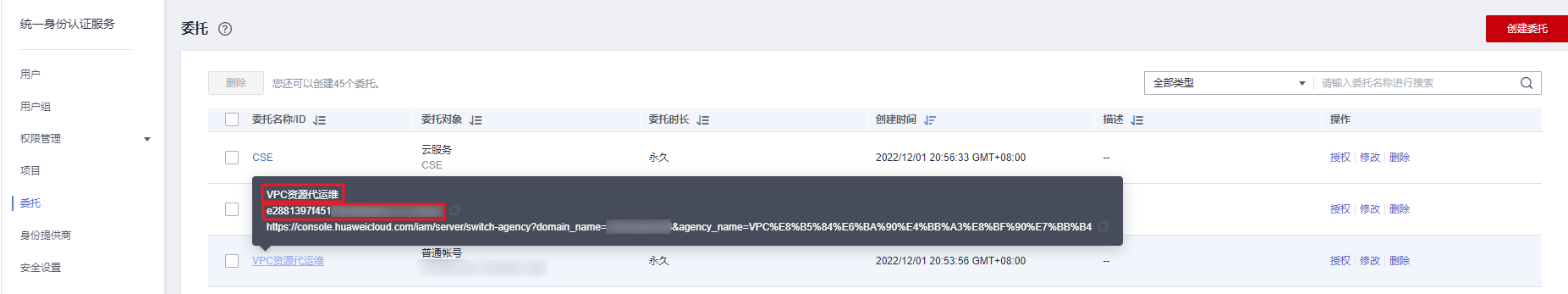 - 登录华为云,进入IAM控制台,选择“委托”页签。