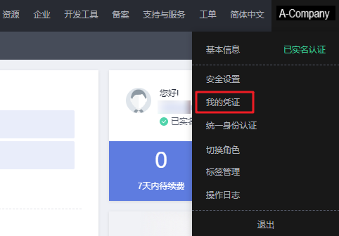 - 在右上角的用户名中选择“我的凭证”。