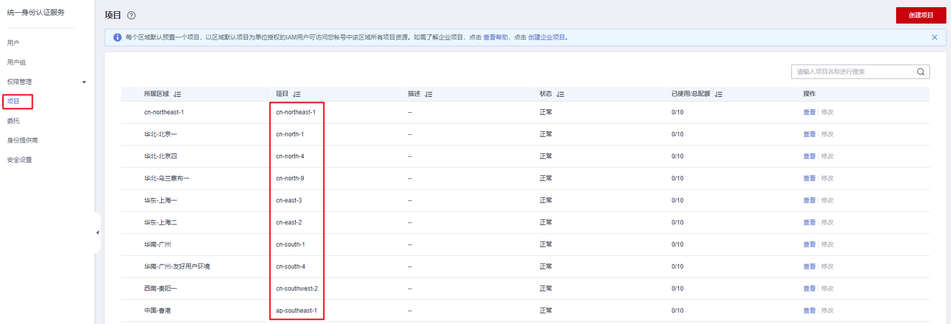 - 登录华为云,进入IAM控制台,选择“项目”页签。