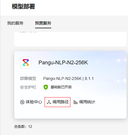 图2 NLP服务的调用路径 - 若调用预置模型,可在左侧导航栏中选择“模型开发 > 模型部署”,在“预置服务”页签,模型列表单击“调用路径”,获取该模型的请求URI。