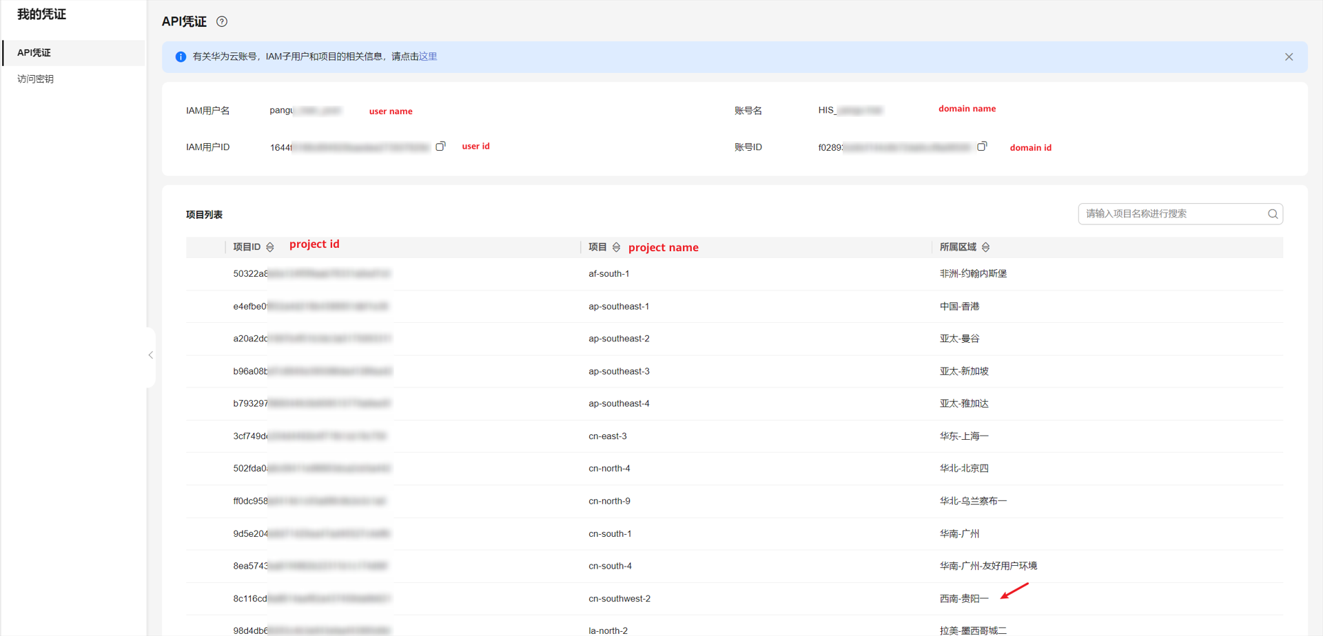 由于盘古大模型当前部署在“西南-贵阳一”区域,需要获取与“西南-贵阳一”区域对应的project id。