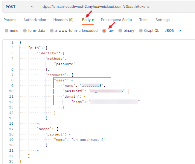图2 填写获取Token接口 - 填写“获取token”接口的请求体。在Postman中选择“Body > raw”选项,参考图3复制并填入以下代码,并填写user name、domain name、password。