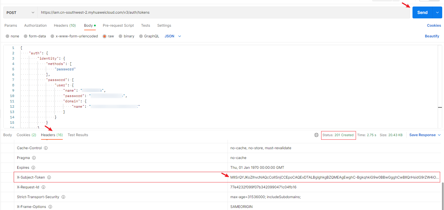 - 单击Postman界面“Send”按钮,发送请求。当接口返回状态为201时,表示Token接口调用成功,此时单击“Headers”选项,找到并复制“X-Subject-Token”参数对应的值,该值即为需要获取的Token。