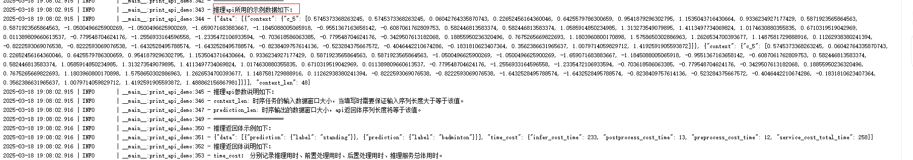 参数解释: 时序数据请求的批处理队列。 约束限制: 盘古时序预测分类任务的输入数据内容,用字典承载。输入数据字典中,键对应特征列名,值为序列数据具体内容。 取值范围: 输入数据中的一行数据。 默认取值: 预测大模型在训练完成后,可以在训练日志页面,“模型训练”日志节点中获取推理api所用的示例数据。填写请求Body时可以参考该示例填写。 |