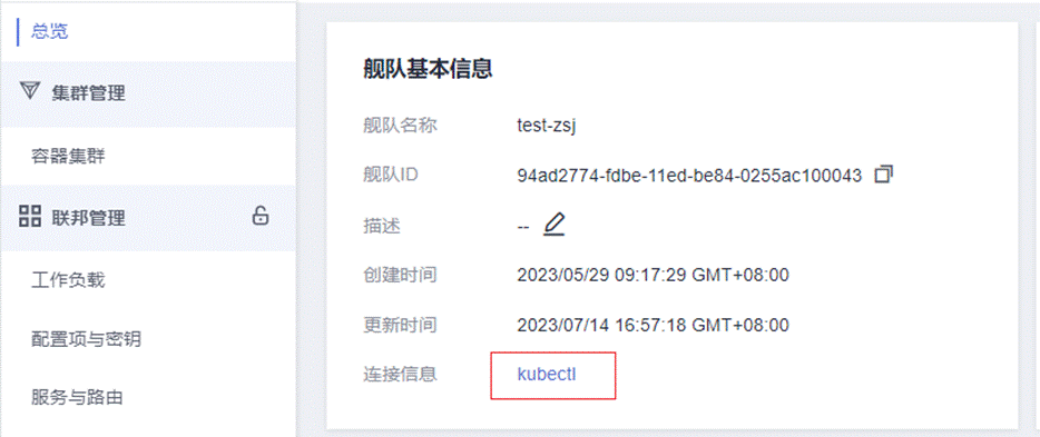 - 登录UCS控制台,单击目标容器舰队名进入“容器舰队信息”页面,在“舰队基本信息”中单击“kubectl”。