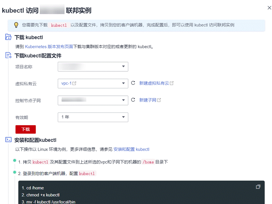 - 参照页面中的提示信息,选择对应的项目名称、虚拟私有云(VPC)、控制节点子网以及有效期,单击“下载”,下载kubectl配置文件。