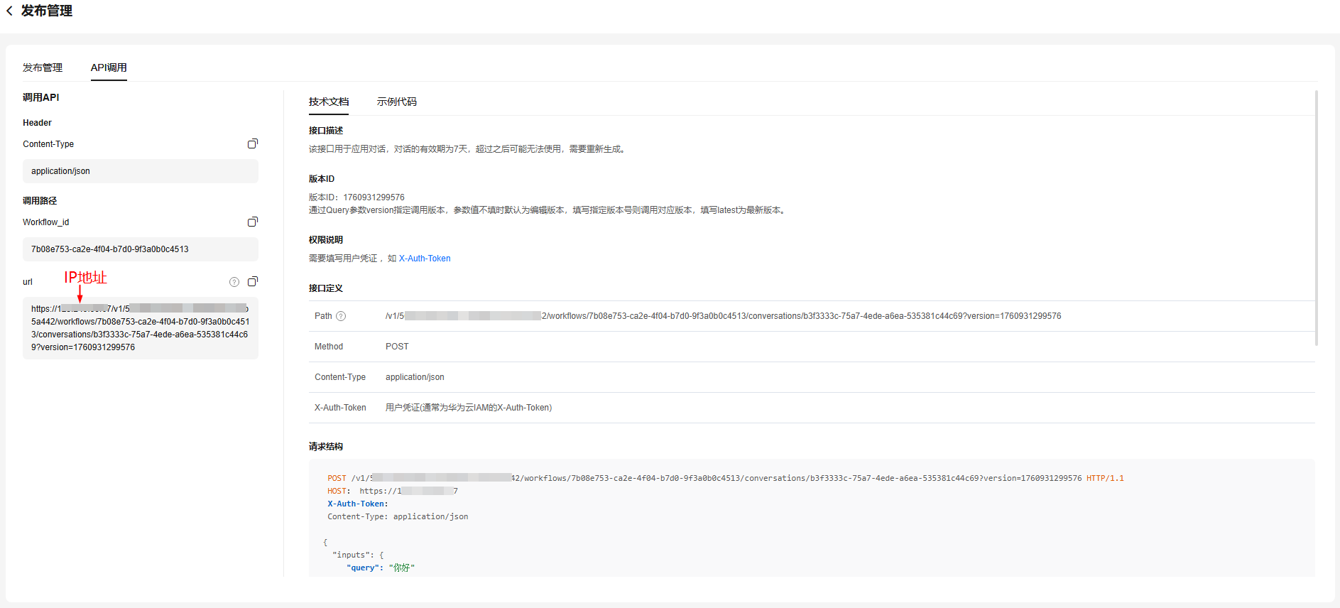。 - 在“发布管理”页面,“API调用”区域,查看URL地址,IP地址即为API的请求地址。