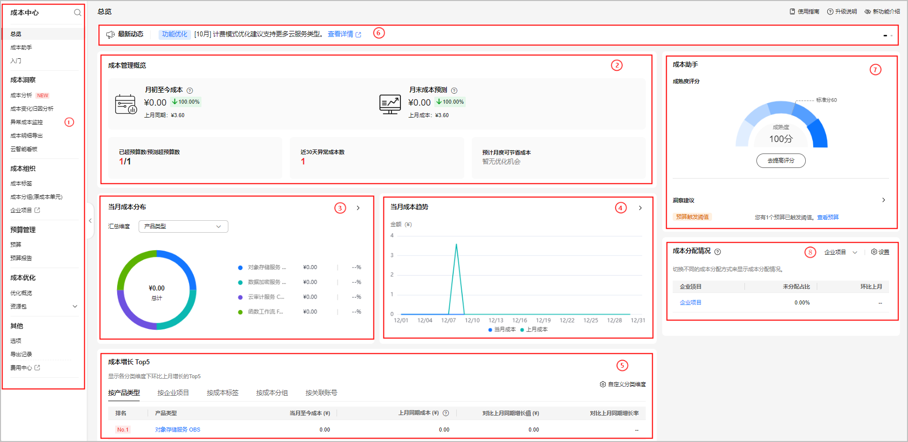 您可以根据实际财务需求,体验华为云为您提供的各种成本管理工具。本章通过介绍成本中心的总览界面、功能等,帮助您快速掌握财务管理功能。
