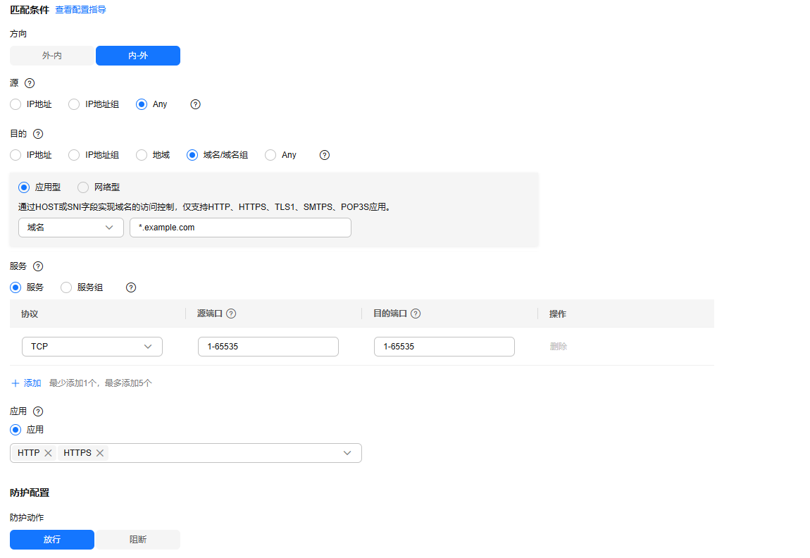 - 目的:选择“域名/域名组”、“应用型”、“域名”,填写*.example.com。