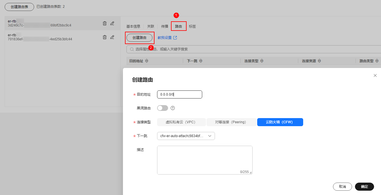 - 添加静态路由,指向防火墙:单击“路由”页签,单击“创建路由”,参数详情见表 创建路由参数说明。