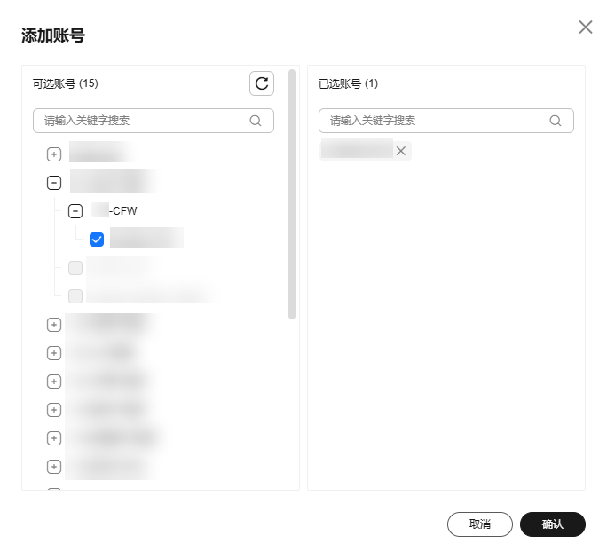 - 单击“添加账号”,弹出页面通过树状展开勾选B账号和C账号,自动添加至右侧“已选账号”,单击“确认”。