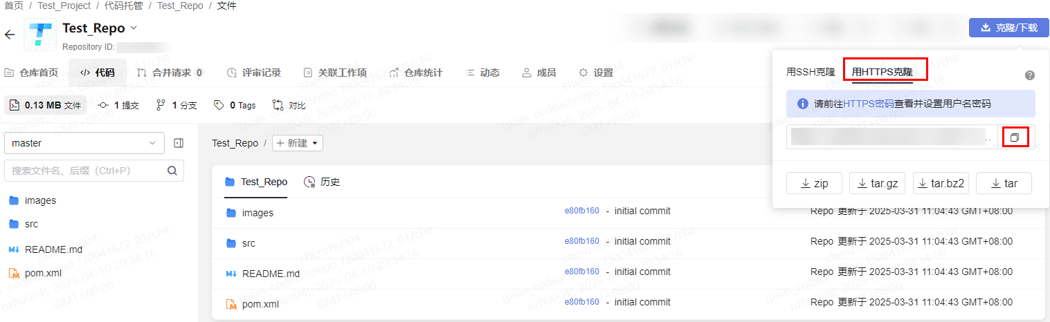 - 小明复制HTTPS地址,克隆代码仓到本地进行开发。