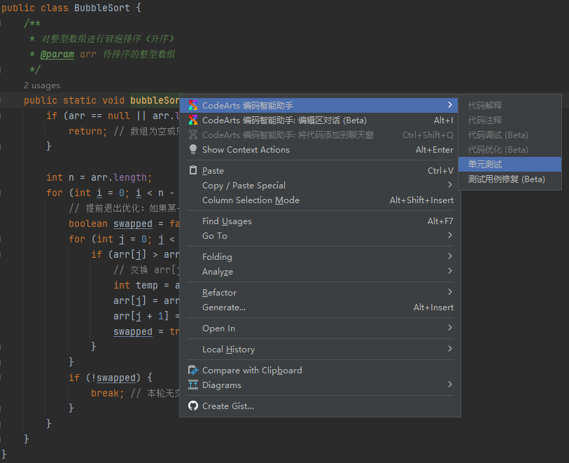 通过CodeArts 编码智能助手自动生成测试用例,可有效验证功能的正确性,发现潜在缺陷,并为后续的维护和优化提供可靠的参考依据,提高测试用例编写效率。本案例以冒泡排序为例,介绍如何通过CodeArts 编码智能助手自动生成测试用例。