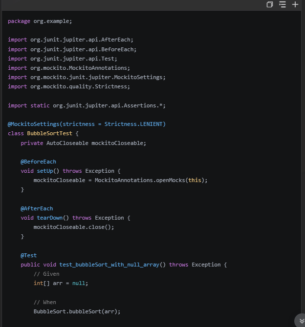 package org.example; import org.junit.jupiter.api.AfterEach; import org.junit.jupiter.api.BeforeEach; import org.junit.jupiter.api.Test; import org.mockito.MockitoAnnotations; import org.mockito.junit.jupiter.MockitoSettings; import org.mockito.quality.Strictness; import static org.junit.jupiter.api.Assertions.*; @MockitoSettings(strictness = Strictness.LENIENT) class BubbleSortTest { private AutoCloseable mockitoCloseable; @BeforeEach void setUp() throws Exception { mockitoCloseable = MockitoAnnotations.openMocks(this); } @AfterEach void tearDown() throws Exception { mockitoCloseable.close(); } @Test public void test_bubbleSort_with_null_array() throws Exception { // Given int[] arr = null; // When BubbleSort.bubbleSort(arr); // Then assertNull(arr); } @Test public void test_bubbleSort_with_single_element_array() throws Exception { // Given int[] arr = {1}; // When BubbleSort.bubbleSort(arr); // Then assertArrayEquals(new int[]{1}, arr); } @Test public void test_bubbleSort_with_sorted_array() throws Exception { // Given int[] arr = {1, 2, 3, 4, 5}; // When BubbleSort.bubbleSort(arr); // Then assertArrayEquals(new int[]{1, 2, 3, 4, 5}, arr); } @Test public void test_bubbleSort_with_unsorted_array() throws Exception { // Given int[] arr = {5, 4, 3, 2, 1}; // When BubbleSort.bubbleSort(arr); // Then assertArrayEquals(new int[]{1, 2, 3, 4, 5}, arr); } @Test public void test_bubbleSort_with_array_containing_duplicates() throws Exception { // Given int[] arr = {3, 1, 2, 3, 1}; // When BubbleSort.bubbleSort(arr); // Then assertArrayEquals(new int[]{1, 1, 2, 3, 3}, arr); } }