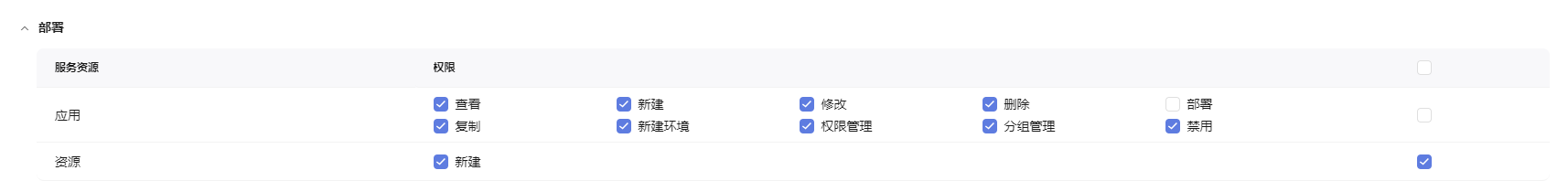 - 部署:除“应用 > 部署”外,勾选其他全部权限,如下图所示。