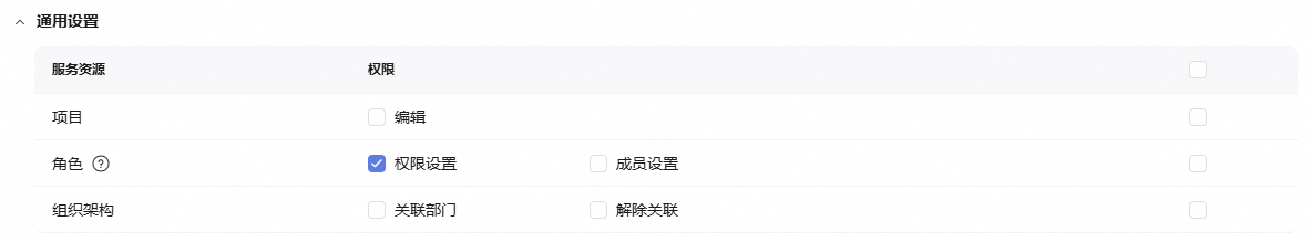 - 通用设置:勾选“角色 > 权限配置”,如下图所示。 图1 通用设置