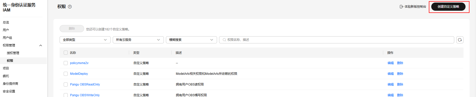 - 在IAM服务控制台中,单击“权限管理 > 权限”,在权限页面单击右上方的“创建自定义策略”。