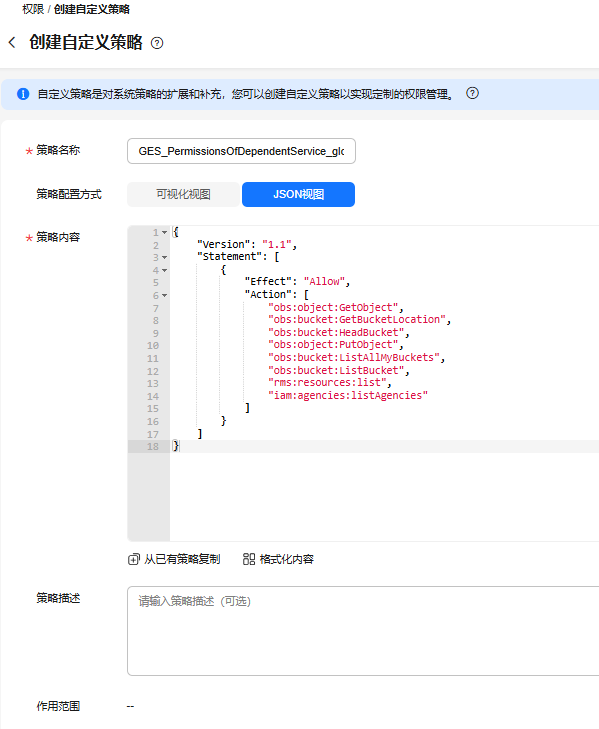 - 在“创建自定义策略”界面,策略配置方式切换至JSON视图,然后按照如下策略内容,分别创建GES_PermissionsOfDependentService_global和GES_PermissionsOfDependentService_region自定义策略。