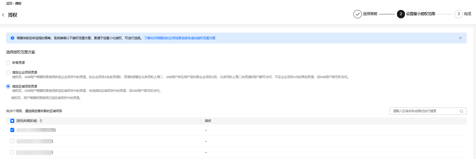 - 授权范围方案选择“指定区域项目资源”下需要授予的区域项目,单击“确定”,完成授权。
