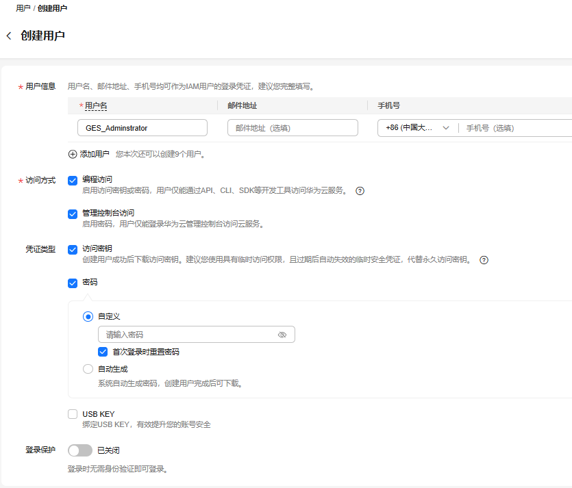 - 凭证类型:勾选访问密钥和密码,推荐为用户自定义初始密码。