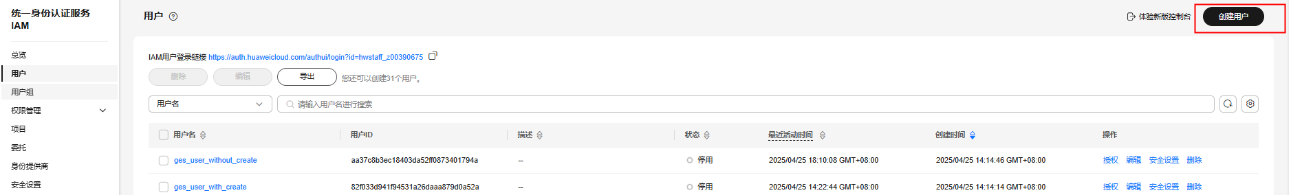 - 在IAM服务控制台中,左侧导航窗格中,选择“用户”,单击右上方的“创建用户”。