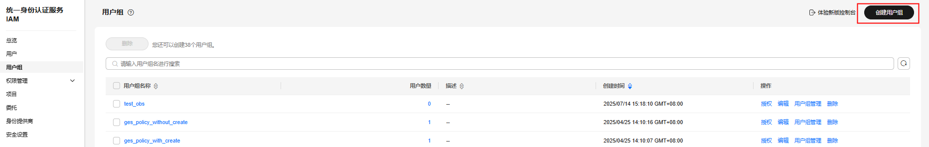 - 在IAM服务控制台中,左侧导航窗格中,选择“用户组”,单击右上角的“创建用户组”。