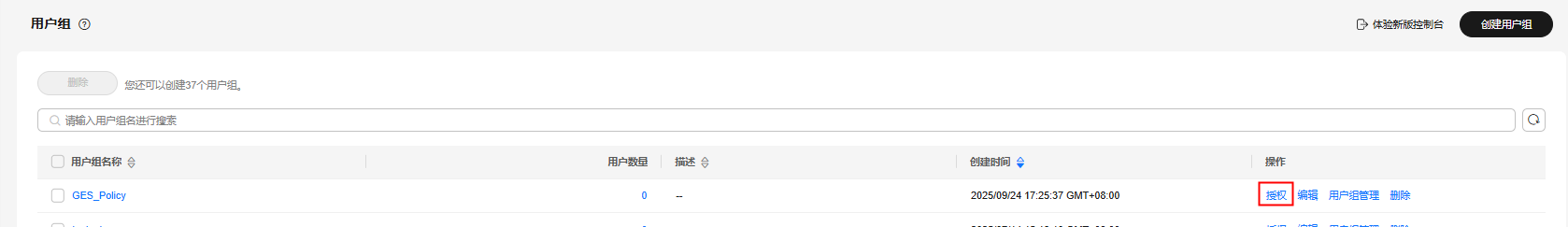 - 在用户组列表中,单击新建用户组右侧的“授权”。