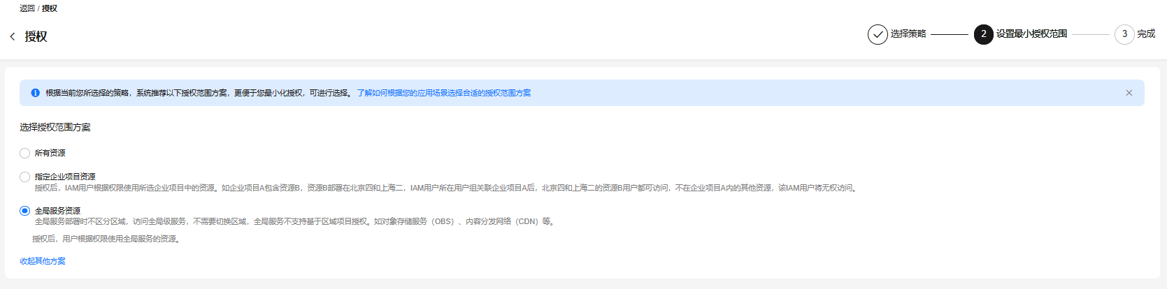 - 授权范围方案选择“全局服务资源”,单击“确定”,完成授权。