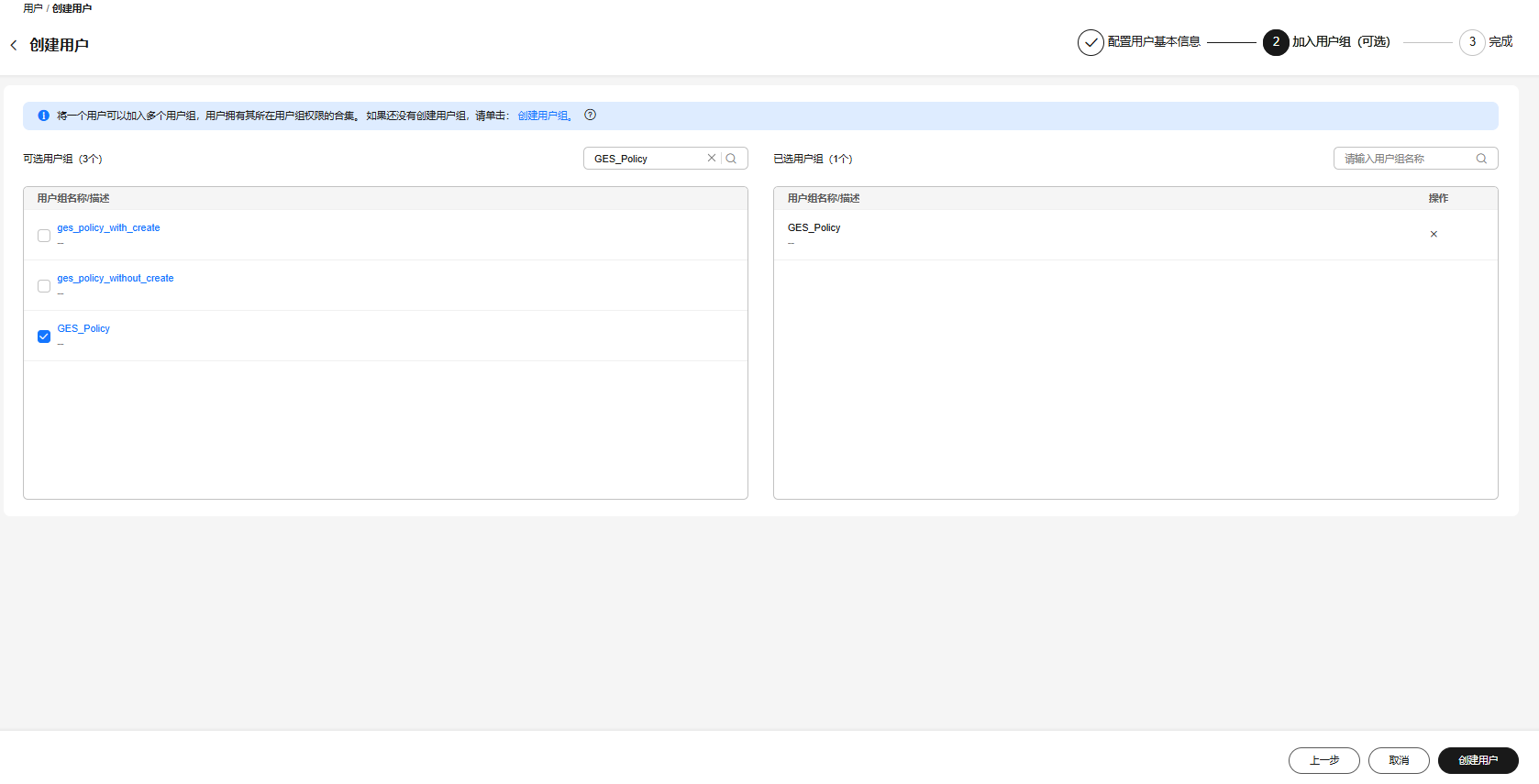 图11 配置用户信息 - 选择将用户加入到GES_Policy用户组,单击页面右下角的“创建用户”。