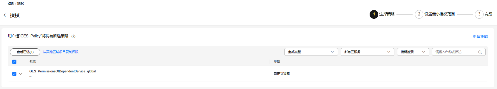 - 在搜索框中输入GES_PermissionsOfDependentService_global,勾选搜索到的自定义策略,单击“下一步”。