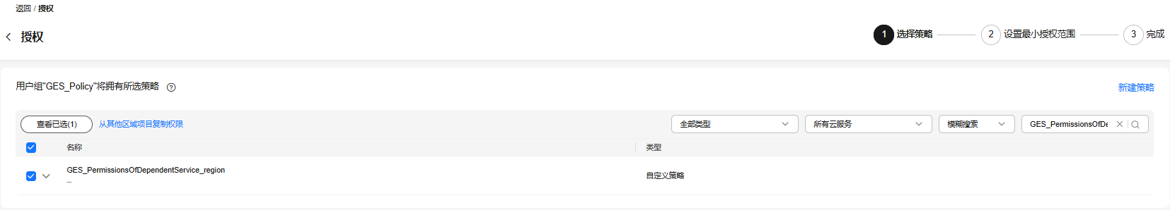 - 重复步骤4,在搜索框中输入GES_PermissionsOfDependentService_region,勾选搜索到的自定义策略,单击“下一步”。