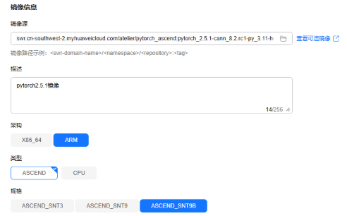 Snt9B:西南-贵阳一 swr.cn-southwest-2.myhuaweicloud.com/atelier/pytorch_ascend:pytorch_2.5.1-cann_8.2.rc1-py_3.11-hce_2.0.2503-aarch64-snt9b-20250729103313-3a25129 Snt9B:中国-香港 swr.ap-southeast-1.myhuaweicloud.com/atelier/pytorch_ascend:pytorch_2.5.1-cann_8.2.rc1-py_3.11-hce_2.0.2503-aarch64-snt9b-20250729103313-3a25129 |