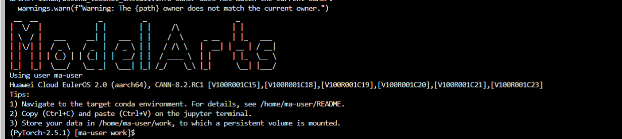 ModelArts提供的Notebook实例默认是以ma-user启动。用户进入实例后,工作目录默认是/home/ma-user/work。