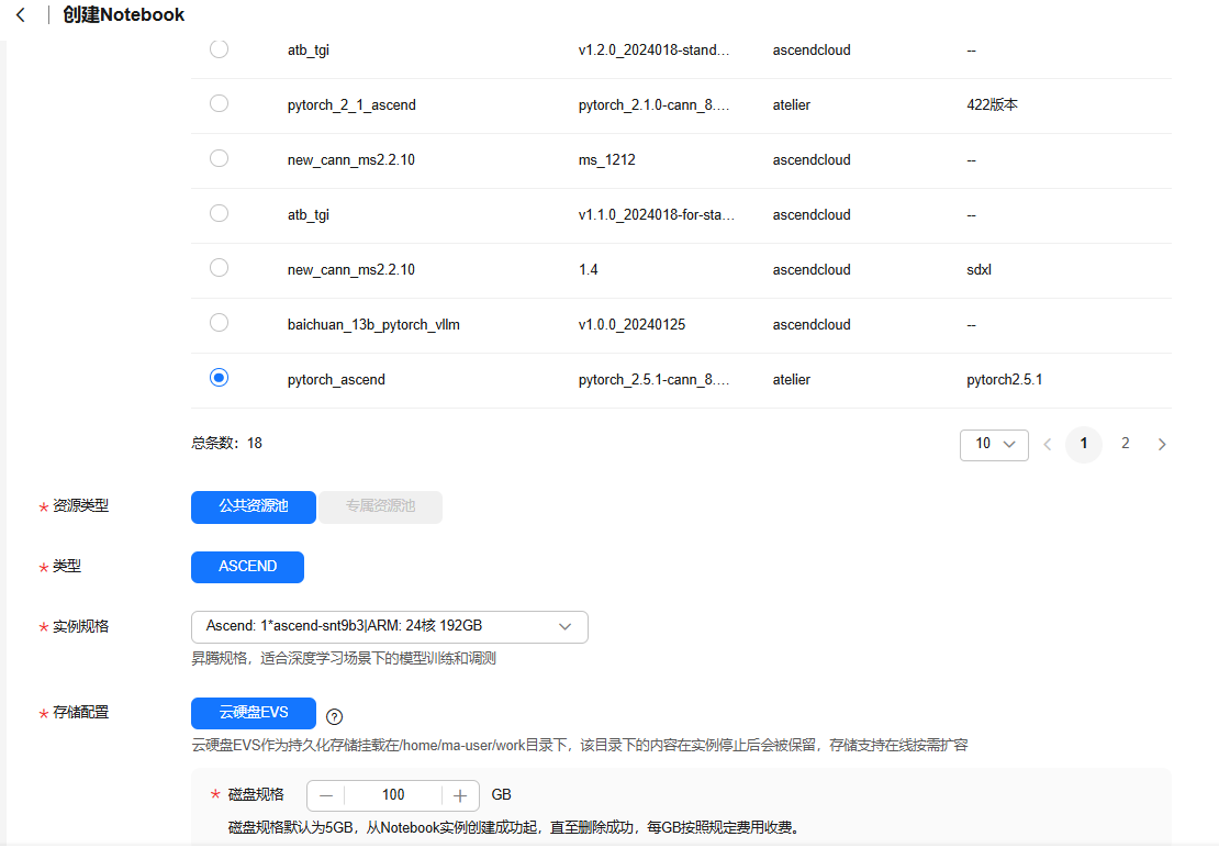 - 请参考Notebook资源开通,创建Notebook实例,在镜像选择时选择自定义镜像,可参考如下配置。资源规格默认5GB,根据需要自行扩容。