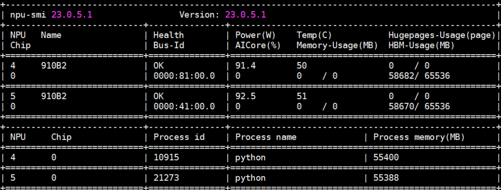 可以通过命令npu-smi info查询NPU卡为容器中的第几张卡。例如下图查询出两张卡,如果希望使用第一和第二张卡,则“export ASCEND_RT_VISIBLE_DEVICES=0,1”,注意编号不是填4、5。图1 查询结果启动推理服务的具体操作步骤请参见启动推理服务(大语言模型)。