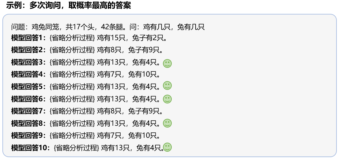同一问题使用大模型回答多次,生成多个推理路径及答案,选择一致性最高的结果作为最终答案。