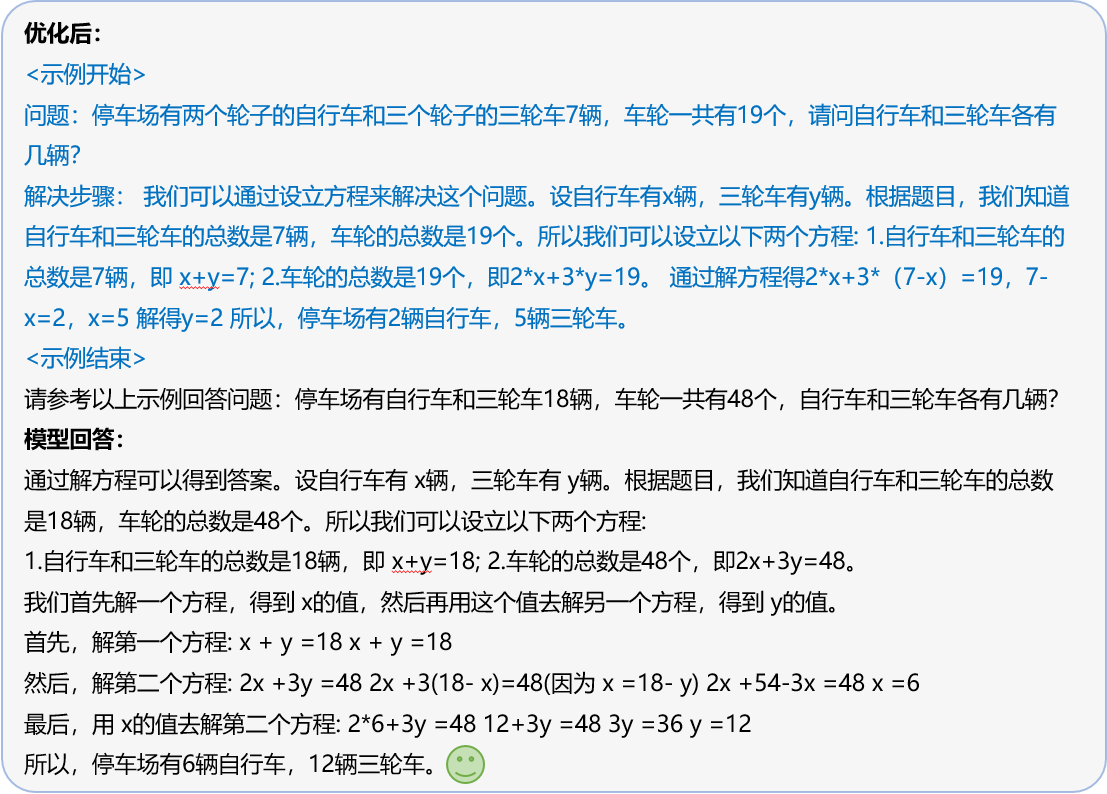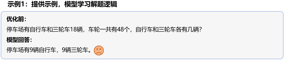对于复杂推理问题(如数学问题或逻辑推理),通过给大模型示例或鼓励大模型解释推理过程,可以引导大模型生成准确率更高的结果。